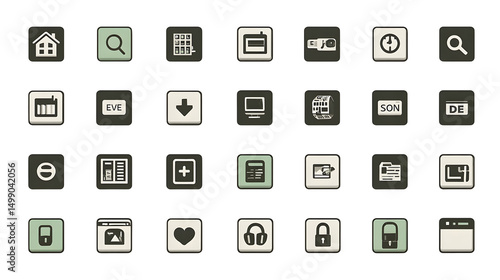 icon, application, software, interface, digital, technology, grid, flat, design, computer, website, presentation, dark, background, beige, grey, element, symbol, banking, calendar, document, search, profile, file, setting, list, summing, remove, info, home, communication, security, media, isolated, vector, illustration, graphic, app, modern