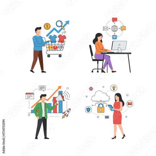 Flat design vector illustrations depicting men and women engaged in various online business activities such as e-commerce, communication, and marketing