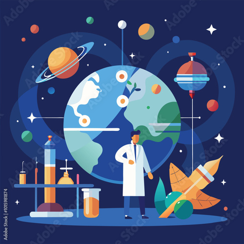 Flat design World Science Day illustration featuring space, planets, and a researcher. Perfect for education, science, and technology-themed projects.