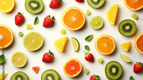 flat fruits include kiwi, strawberries and oranges slice background.ai