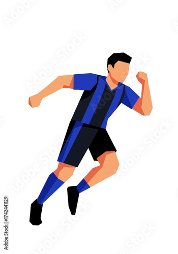 soccer player, football player, running, athlete, sport, vector, illustration, geometric, minimalist, man, person, sprint, dynamic, movement, game, competition, training, exercise, activity, fitness, modern, abstract, graphic, blue, black, uniform, jersey, team, energy