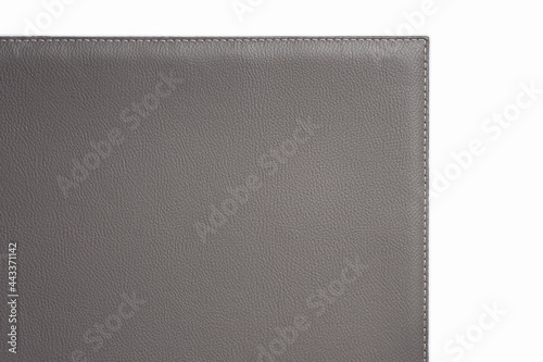 Flat gray fine texture of genuine leather. Close-up edge isolated at white background