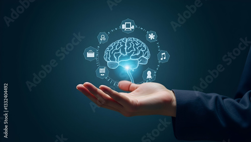 Flat Hand holding holographic Neural Processing Unit (NPU) icons with AI and machine learning symbols representing advanced neural computing in empty space concept as Hand holds holographic Neural Pro