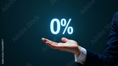 Flat Hand interacting with holographic zero percent interest rate symbol representing zero percent financing discounts no commission sales promotions in empty space concept as Hand interacts with holo