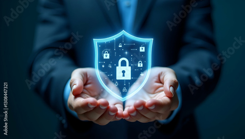 Flat Hands Forming a Shield with Holographic Locks: A Cute Vector Illustration of Security Protection