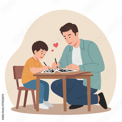 Flat Illustration Father and Son Drawing Together at Wooden Table