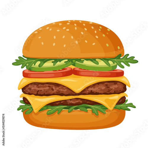 Flat Illustration of a gourmet avocado burger with arugula, tomato, and melted cheese on a brioche bun