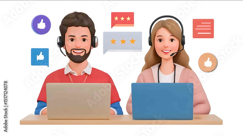 flat illustration of a male and female support agent assisting customers on laptops customer icons giving thumbs up above 5star reviews floating minimalist