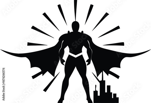 Flat Isometric Vector of Superhero Silhouette Over Futuristic City Skyline – Cinematic Light Rays Illustration