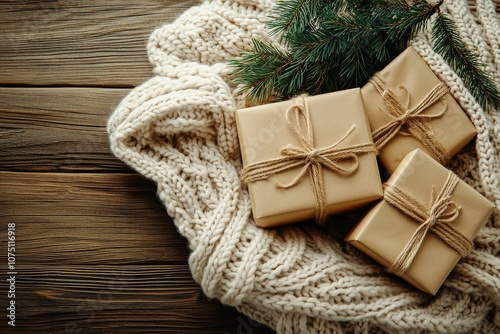 Flat lay of Christmas presents, pine branches, and knitted white blanket on a wooden table with copy space. Festive holiday composition.