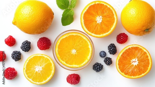 Flat lay of fresh oranges, raspberries, blackberries, and blueberries on white background.