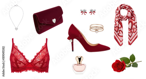 Flat lay of red lingerie set with high heels, perfume, jewelry, handbag, scarf, and rose on white background, perfect for romantic gifts or Valentine's Day