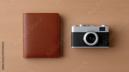 Flat lay of vintage camera and brown leather notebook on wood surface, ideal for travel planning and photography concepts.
