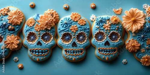 day of the dead, colourful, festival, celebration, holiday, traditional, cultural, sweet, background, baking, artistic, halloween, confectionery, sugar, skull, cookie, decorated, flower, dia, colourful, festive, mexican, tradition, dessert, culture, vibrant, treat