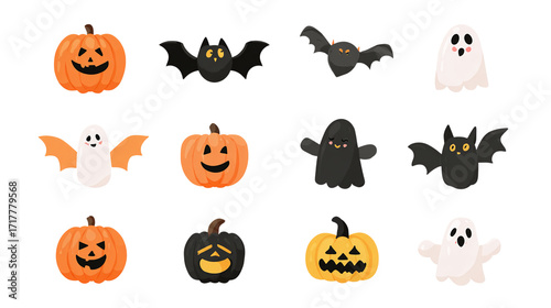 Flat spooky Halloween icon set with pumpkins, bats, and ghosts, isolated on transparent background