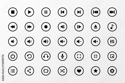 music, play, pause, icon, signs, buttons, list, record, mute, next, audio, stop, forward, volume, arrow, push, element, multimedia, symbol, rewind, video, sound, media, playback, set, collection, player, mp3