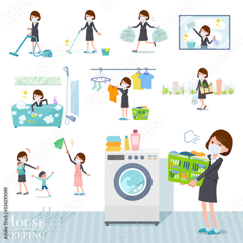 woman, mask, hay fever, virus, cold, prevention, business, office, suit, ol, employee, occupation, people, homemaker, housekeeping, cleaning, cleaning, live, house, lifestyle, labor, housekeeper, bed, vacuum cleaner, garbage, child rearing, nanny, cleaning, laundry, washer, shopping, bathe, bathroom, duster, character, flat, vector