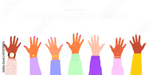 Flat vector cartoon illustration of women's hands of different nationalities raised up. A banner with space for text. White background.
