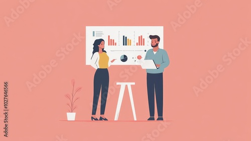 Flat vector illustration of a man and a woman analyzing business development metrics, standing by a simple infographic display of revenue growth.