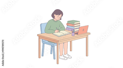 Flat vector illustration of a student studying at a desk, representing the concept of education and learning