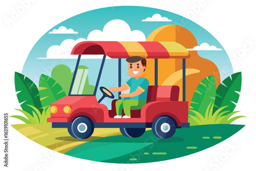 golf cart, driver, man, vehicle, vector, illustration, nature, landscape, green, grass, road, tree, hill, sun, cloud, sky, travel, tour tourism, vacation, holiday, transport, journey, recreation, leisure, fun, adventure, summer, happy, smiling