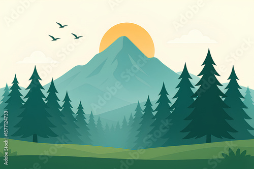 Flat Vector Mountain Sunrise with Pine Trees and Birds