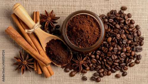Flatlay Coffee Body Scrub Jar Wooden Spoon Coffee Beans and Cinnamon Stick Spa Scene