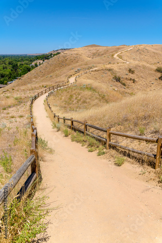 Flattened dirt path with wooden barriers on the side on a mountain at Boise, Idaho. Mountain trail in the middle of grassland against the clear blue sky background.