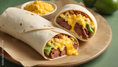 Flavorful breakfast burrito with scrambled eggs, hearty sausage, and melted cheese, wrapped in a warm tortilla