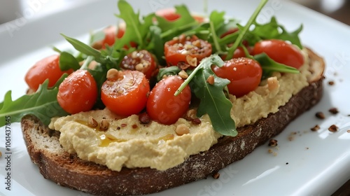 Flavorful Vegan Toast with Hummus,Tomatoes,and Arugula for a Healthy Delight
