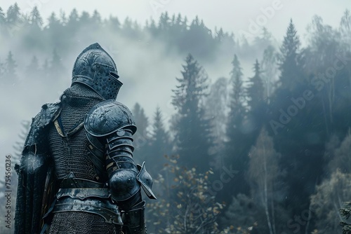 Flickering apparition of an ancient knight in full armor at the edge of a misty forest.