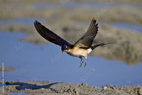 fliegende Rötelschwalbe (Cecropis rufula) mit Schlamm als Nistmaterial im Schnabel // European red-rumped swallow