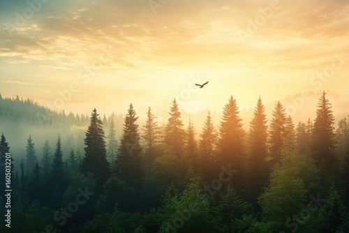 sunrise, flight, bird, nature, serenity, dawn, morning, landscape, calmness, forest, skyline, beauty, outdoors, wildlife, scenery, fog, sunlight, adventure, exploration, horizon, colours, peaceful, soft light, silhouette, wilderness, freedom, migration, alpine, sky, scenic view, calm, awakening, growth, majestic, atmosphere, fresh air, natural beauty, ecotourism, natural phenomenon, pine tree, environmentally friendly, travel