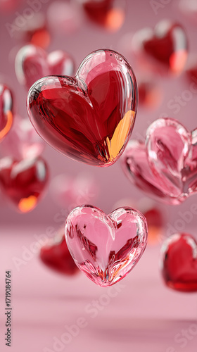 Floating 3d hearts in shades of red and pink against a soft pastel background. Perfect for Valentine’s Day themes, love celebrations or elegant romantic decor concepts.