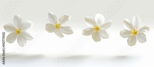 Floating beautiful white Jasmine flower isolated on white background, depicting levitation or zero gravity concept. High-quality image capture.