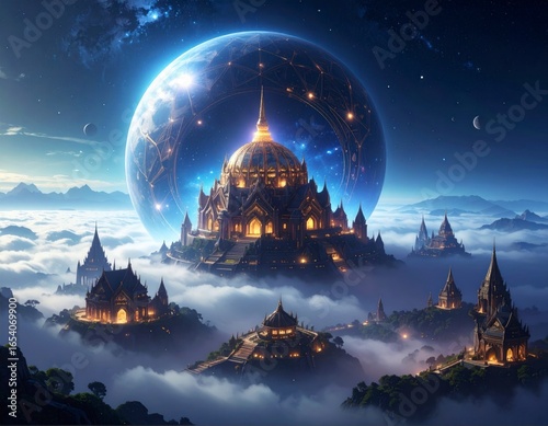 temple, sphere, cosmic, floating, geometric, glowing, structure, night, sky, fantasy, surreal, illumination, space, star, architecture, celestial, abstract, futuristic, mystical, dreamlike, earth, landscape, digital, art, visualisation, universe, cloud, light, dark, blue, gold, ancient, civilisation, design, composition, texture, element, background, atmosphere, imagination, creative, unique, vibrant, concept, artistic, illustration, orbit, evacuated, energy