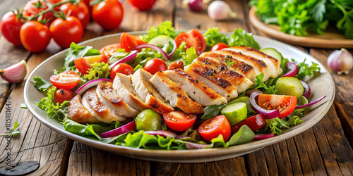 Floating grilled chicken meat alongside a fresh tomato vegetable salad, isolated on a transparent background, showcasing a vibrant and healthy culinary presentation.
