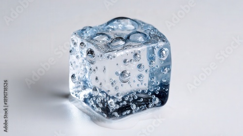 floating ice cube with trapped air bubbles macro photography isolated on white background