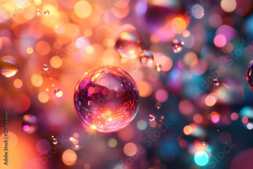 Floating iridescent bubbles reflected in a vibrant bokeh background, creating a dreamy, magical scene.