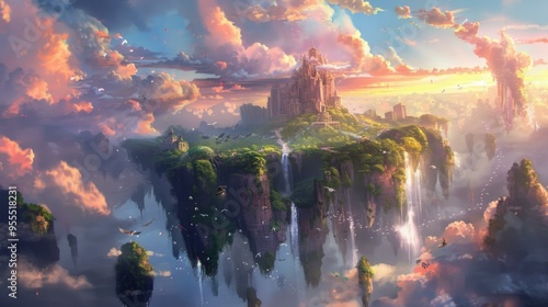 Floating islands in the sky during a vibrant sunset, evoking fantasy worlds.