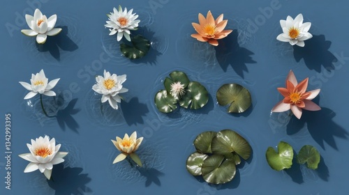 lotus, flower, water lily, aquatic, plant, duck pond, still, water, nature, beauty, garden, floral, blossom, colours, delicate, vibrant, design, image, digital, art, realistic, illustration, top, view, flat, symmetry, arrangement, photorealistic, rendering, three-dimensional, aesthetic, calm, peaceful, tranquil, stillness, natural, fresh, summer, spring, decoration, decorative