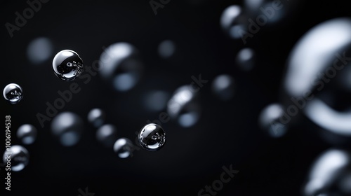 Floating metallic spheres in various sizes and shades of silver, suspended in a deep black abstract background.