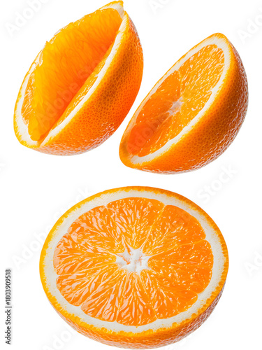 Floating orange slices isolated on transparent background. Perfect for healthy food, citrus, and vitamin concept designs.