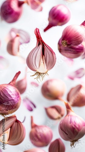 Floating shallots in air, slices, with whole shallots on white background