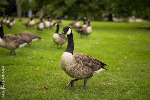 Flock of canada gooses, beautiful goose portrait in park