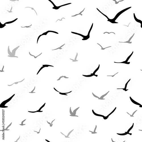 Flock of flying silhouette birds. Birds seamless pattern. White seagulls on a blue background. Vector