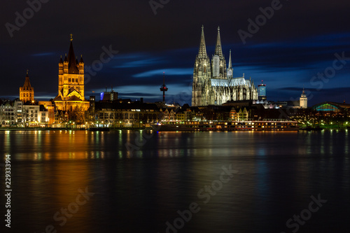 Flood in cologne at night. Cologne Cathedral.