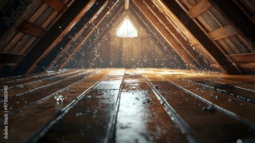 Flooded attic with soaked wooden beams, water pooling on aged floorboards, visible water damage under dim light, water splash impacts scattered