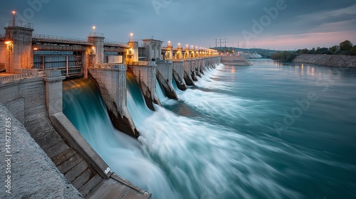 Flooded Dam Wall with Flowing Water and Yellow Lights at Dusk – Hydroelectric Infrastructure Landscape