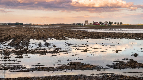 agriculture, farm, field, flooded, water, mud, dirtied, rural, landscape, sky, cloud, sunset, twilight, overcast, wet, saturated, earth, cultivation, planting, spring, autumn, weather, natural, scene, country, horizon, distant, building, barn, red, infrastructure, agricultural, land, farming, season, precipitation